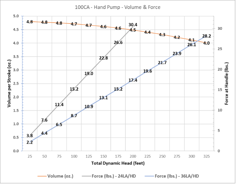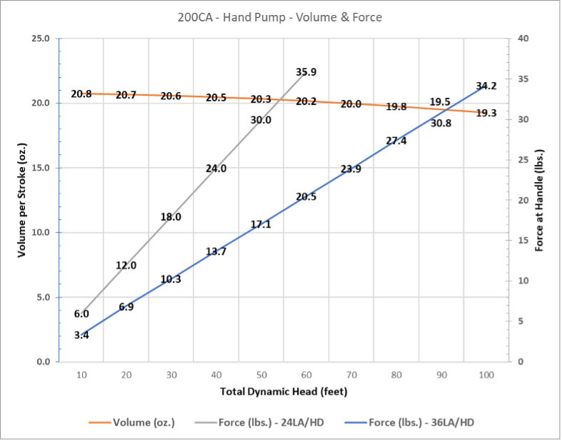 The charts below provide the water volume per stroke and the required downward force applied to the handle for different cylinder and handle options.