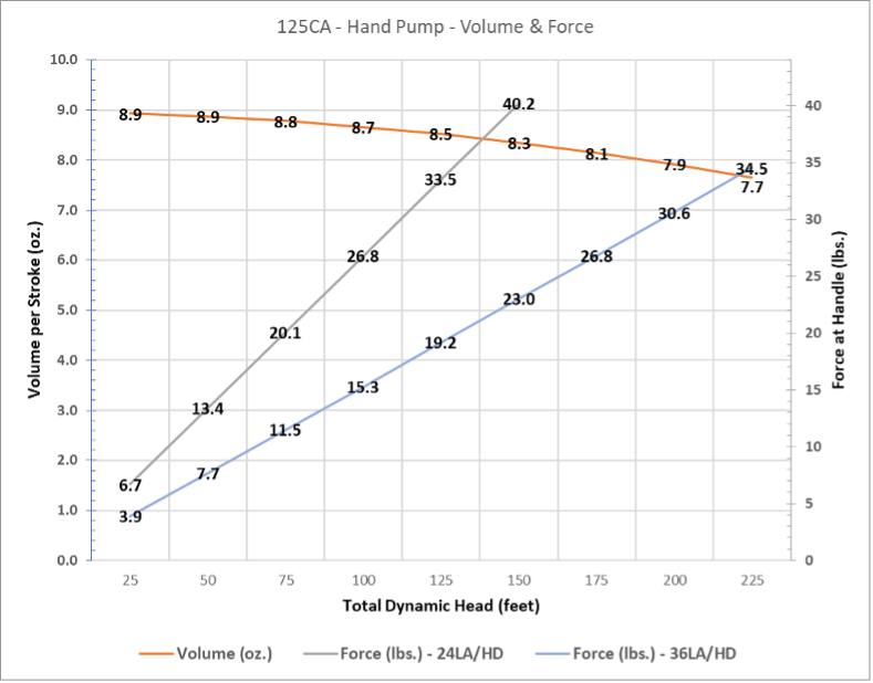 The charts below provide the water volume per stroke and the required downward force applied to the handle for different cylinder and handle options.
